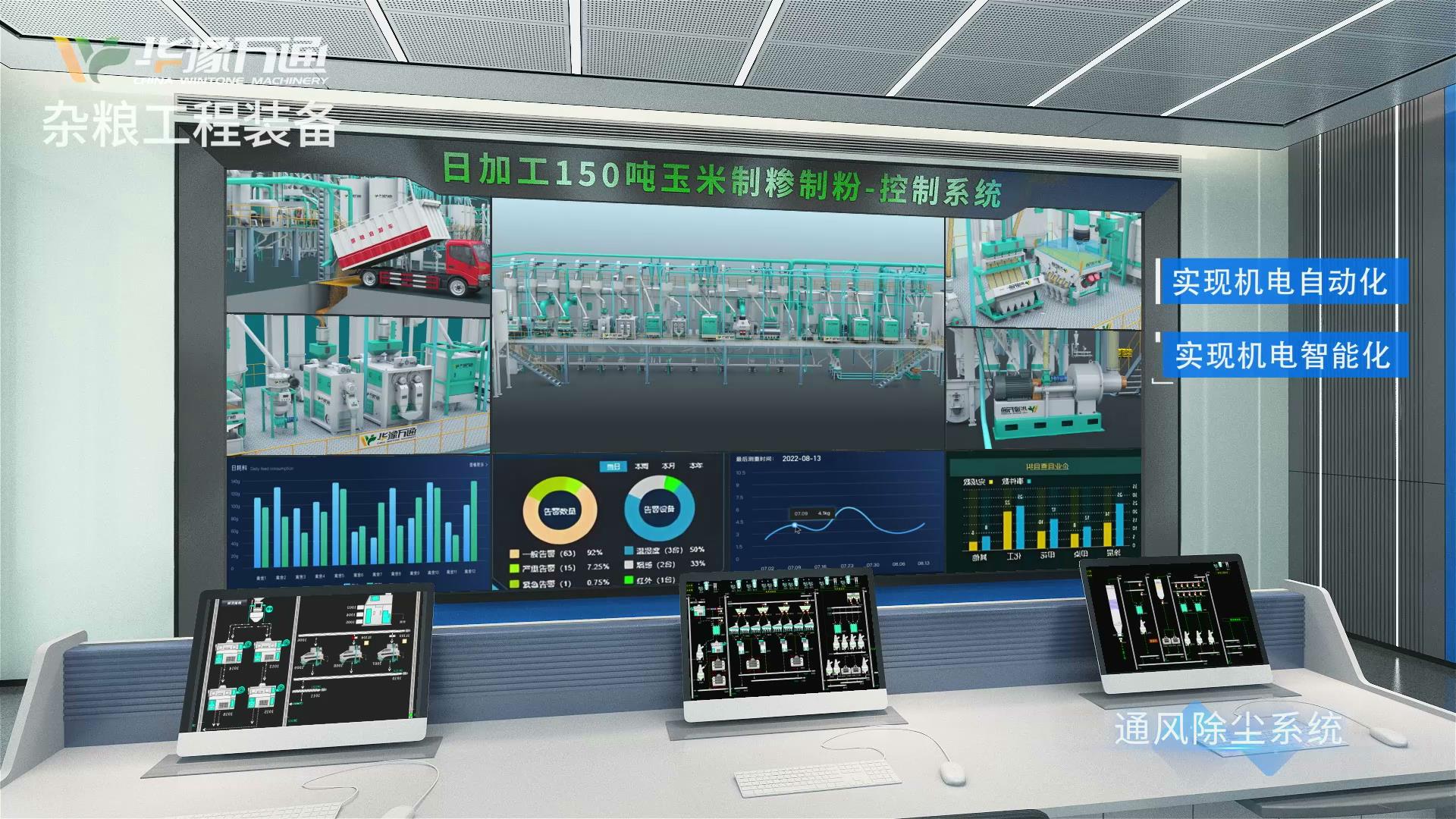 華豫萬通日加工150噸玉米制糝制粉創新工藝,設計為兩層平臺結構,三層設備布置,總長48m,寬8.0m,高10m,總裝機容量520kw,噸料電耗約50度,糝粉總收率≥65,糝內目測無皮、無黑星,粉內無麩皮,遠超國家標準。配備PLC智能化控制,可實現智慧化,數字化,可視化,無紙化生產。